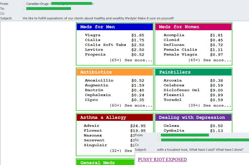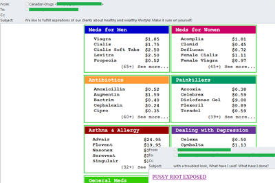 Auch den Skandal um die russische Punkband Pussy Riot ließen die Spammer nicht ungenutzt. Eine englischsprachige Mitteilung enthielt einen Link, der angeblich auf eine Neuigkeit über die Band verwies. Beim Klick auf diesen Link öffnete sich allerdings eine Website mit Viagra-Werbung.