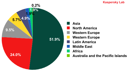 Unter den Spam verbreitenden Regionen steht noch immer Asien an erster Stelle (mit 51,9%, das ist im Vergleich zum Vormonat um 1,4 Prozentpunkte mehr). Zum Führungstrio gehören wie gehabt Nordamerika und Westeuropa.