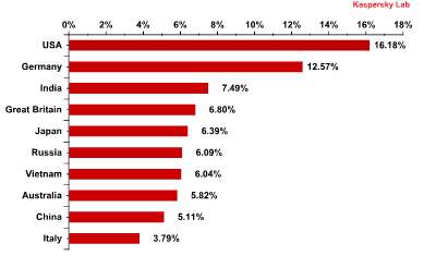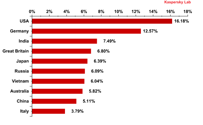 In die USA (16,2%) und Deutschland (12,6%) werden nach wie vor die meisten schädlichen Nachrichten gesendet. Während sich allerdings der Anteil Deutschlands gegenüber dem Vormonat nicht verändert hat, steigt die Menge von Schadspam in den USA weiter an (+3,6 Prozentpunkte), so dass dieses Land im November auf Platz eins nach Zahl der Alarme von Kaspersky Mail Antivirus landete. Der Anteil der übrigen Länder aus dem Rating unterlag keinen wesentlichen Veränderungen.