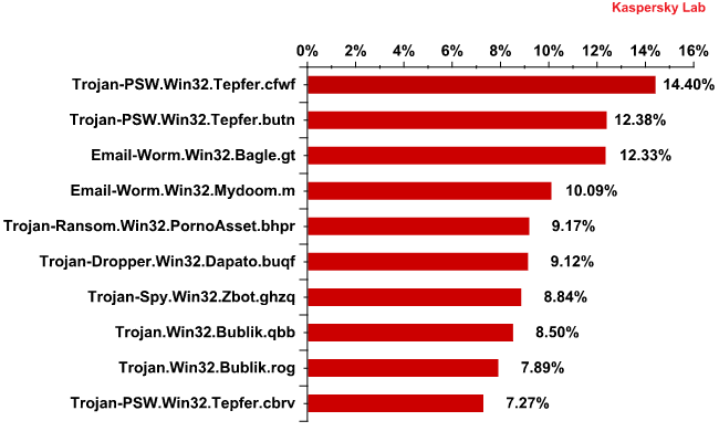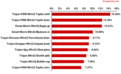 Die TOP 10 der via E-Mail verbreiteten Schadprogramme haben sich im Vergleich zum Vormonat deutlich verändert. Auf Platz eins positionierte sich Trojan-PSW.Win32.Tepfer.cfwf – ein Passwörter stehlendes Programm. Im Rating waren zudem zwei weitere Programme aus dieser Familie vertreten.