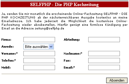 <TABLE width="420" border=0 align="center" cellPadding=0 cellSpacing=0> <TR> <TD bgcolor="#000000" ><IMG height=1 src="transparent.gif" width=1></TD> </TR> <TR> <TD height=2></TD> </TR> <TR> <TD height=18 class=headlineweiss> <div align="center"><strong>SELFPHP - Die PHP Kochzeitung</strong></div> </TD> </TR> </table> <!-- Formular Anfang --> <TABLE width="420" align="center" border="0" class="table"> <TR> <TD colSpan=4> <div align="justify"><br> Ja, senden Sie mir monatlich die erscheinende Online-Fachzeitung SELFPHP - DIE PHP KOCHZEITUNG ab der nächsterreichbaren Ausgabe kostenlos an meine Emailadresse. Ich habe jederzeit die Möglichkeit die kostenlose Online-Fachzeitung wieder abzubestellen. Hierfür genügt eine formlose Kündigung per Email an die Adresse zeitung@selfphp.de<br><br></div> </TD> </TR> <TR> <TD colSpan=4><?PHP echo $errorMessage; ?></TD> </TR> <TR> <TD align=center colSpan=4></TD> </TR> <TR> <TH align=left>Firma:</TH> <TD><INPUT class="inputField" size="60" name="company"