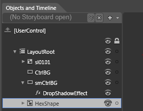 Up to this point, you have been simply adding objects to the Silverlight project with no concern as to its order in appearance. Like most developers already understand, the Objects and Timeline is helpful for identifying different objects and canvases (discussed in later modules) and able to communicate the stacking order of the project. If you look at your Objects and Timeline panel, you will see that the stack might be considered the opposite of what you might expect (if you typically use graphics applications). The HexShape is higher in the stacking order, and is listed as being on the top of the CtrlBG and the smCtrlBG, when actually it is under those items. That is because the stacking order in the Objects and Timeline panel starts at the bottom. Meaning, the object at the top of the stacking order is actually at the bottom of the visual stack. You can click and drag items, much like you would do with layers in Adobe applications to change this order, but it can be easier to use the menu items, as you will see in this next step.